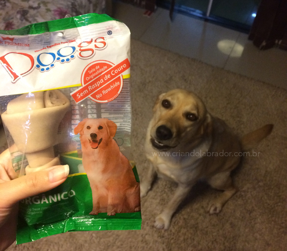 Após a minha terrível experiência com os palitinhos de couro, raramente dou petiscos que não sejam frutas para minha Labrador. Encontrei no mercado um “osso” vegetal, da Doogs Pets, quis testar, uma porque distrai o cachorro e outra que também limpa os dentes.